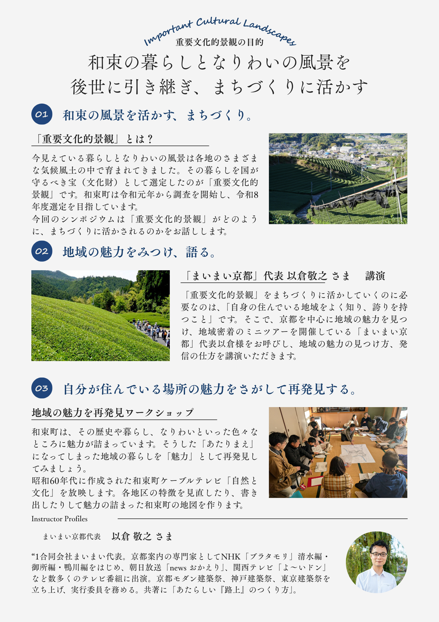 いま、和束町では、和束の暮らしが生み出した風景を守るために、国選定の文化財「重要文化的景観」を目指しています。令和8年度の選定に向け、「重要文化的景観」の制度や取り組みについてわかりやすく説明します。